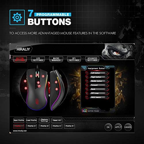 - Un software de programación profesional: adoptó el último chip de juego profesional PMW3325 para capturar movimientos rápidos y precisos para un control preciso. 5 configuraciones de DPI ajustables: 1000/2400/3600/5000/7000/10000, ajustables rápidamente para diferentes escenarios de juego [Descargue el software en hiraliy.net/downloads/]