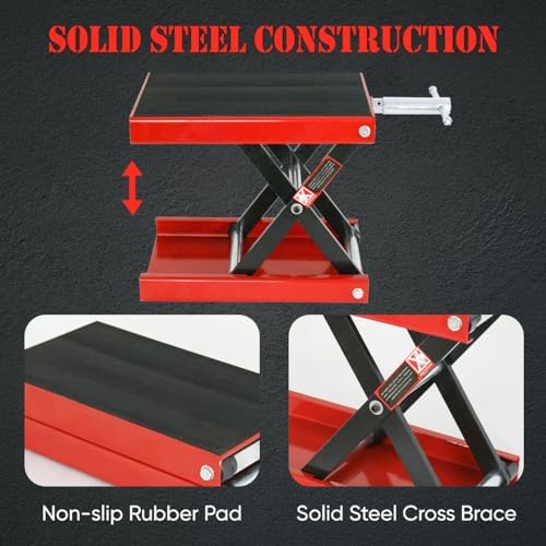 Features: Solid steel construction in a red and black powder coated finish Two (2) variable screw adapters Simple crank operation For use in the garage, shop, or at the track. Designed to fit most motorcycle models. Specifiactions: Product Size: 15.4 x 9.7 x 3.2 inch(L x W x H) Top Platform Size: 15.4 x 9.7 inch(L x W) Max. Capacity: 1100 lbs Lifting Height Range: 3.2 -13.6 inch Net Weight: 29 Ibs