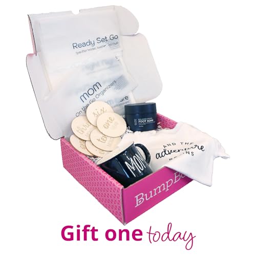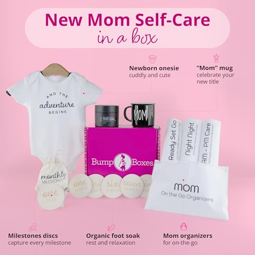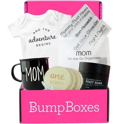 Bump Boxes 3rd Trimester & Postpartum Gift Set for New Moms with Milestone Disc, Baby Onesie, Travel Bags, Ceramic Mug, Organic Foot Soak, Gift for Mother to Be