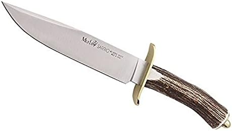MUELA SARRIO-19A: fixed blade, 7-1/4 inch blade, deer horn handle, brass guard and cap, Plain edge, drop point blade.
