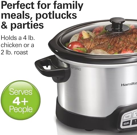 Hamilton Beach programmable slow cooker know when dinner will be ready with flexible programming options. With the Hamilton Beach programmable slow cooker, making a delicious, home-cooked meal is as easy as putting a few ingredients in the Crock and turning it on. Its 4 quart Capacity and oval shape make it ideal for cooking a 4 lb. Chicken or roasting meat to perfection. And with more programming options than Crock-Pot Smart-Pot, this Hamilton Beach slow cooker gives you the ultimate selection of temperature and cooking time combinations. There's no need to monitor the cooking process - the wraparound element provides even heating that doesn't require stirring. Once cooking time is up, the slow cooker automatically switches to warm. When you're done, both the lid and Crock remove easily and can go into the dishwasher for cleanup.