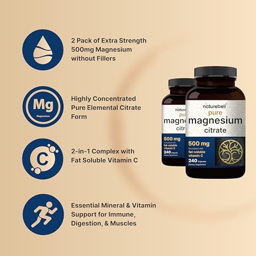 NatureBell Magnesium Citrate 500mg, 480 Cápsulas (2 Paquetes) | Forma Elemental de Alta Pureza | Apoyo para el Corazón, Músculos y Digestión | No OGM, Sin Gluten