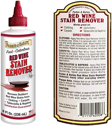 Parker & Bailey Red Wine Stain Remover - Instant Stain Removal, Fast Acting Odorless Spot Remover for Carpets, Upholstery, Furniture, Clothing and Other Fabric, Detergent Booster - 8 oz Bottle
