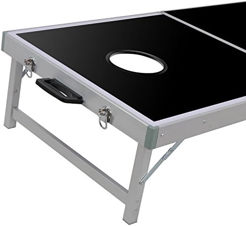 Features: -Well constructed and easy to open. -Platforms fold and lock into place. -UV-resistant and waterproof platforms. -Perfect for just having some friends over or taking with you. -Great for family gatherings, outdoor church events and especially camping trips. -The boards offer a bounce free target with just enough slide for a great game. -The size and weight of the bags is just right, constructed of thick cloth material. 4FT x 2FT Aluminum Framed Dimensions: -Overall Dimensions: 47.4''(L)x 23.8''(W) x 11.02''(H) -Folded Dimensions: 24''(L)x 23.8''(W) x 4.13''(H) -Bean Bag: 5.3'' x 5.3'' -Corn Hole: 5.7''(Diameter) -Platform Weight : 13.25 lbs -Bean Bag Weight (Combined): 5.28 lbs 4FT x 2FT Aluminum Framed Package Included: -2 X Platforms -4 X Red bean bag -4 X Blue bean bag -2 X Shoulin bag -1 X Manual 3FT x 2FT Aluminum Framed Dimensions: Overall Dimensions: 35.6”(L)x 23.6”(W) x 11”(H) Folded Dimensions: 35.6”(L)x 23.6”(W) x 1.9”(H) Bean Bag: 5.3”(L) x 5.1”(W) Corn Hole: 5.7”(Diameter) Platform Weight (Combined): 13.67 lbs. Bean Bag Weight (Combined): 7.04 lbs. 3FT x 2FT Aluminum Framed Package Included: -2 X Platforms -4 X Red bean bag -4 X Blue bean bag -1 X Shoulin bag -1 X Manual Specification: -Color: Black(red & blue bags) -Material: MDF, Polyester -Recommended Age: 13+ years -Choking Hazard: Bean Bags -No assembly required