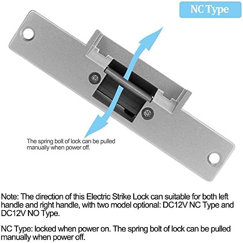 Product Specifications:Material: Stainless steelWorking Voltage: 12VDCCurrent: 200mAHolding Force: 500kg / 1100LbsFunction: Built-out MOVSize: 150x39.5x34 mm / 5.91x1.56x1.34 inchSuitable For: Wooden Door, Metal Door, PVC DoorProduct Features:1, Working mode: Fail-safe type, NC (Normal Close) mode, unlocked when power is removed.2, Mode of high quality metal materail, high-temperature painted, durable and beautiful article.3, The spring bolt of lock can be pulled manually when power is removed.4, With two contacts and no polarity requirement. (The lock will have polarity when a diode added.)5, This electric strike lock has to work with mechanical lock or knob lock which need to buy in additional.Warm Tips: Before ordering, please check the size of door's frame to avoid wrong purchase! Sincerely hope that our electric strike door lock can bring security to you and your assets.Package List:1 x Electric Strike Lock(NC type)1 x Bag of installation kit1 x Manual