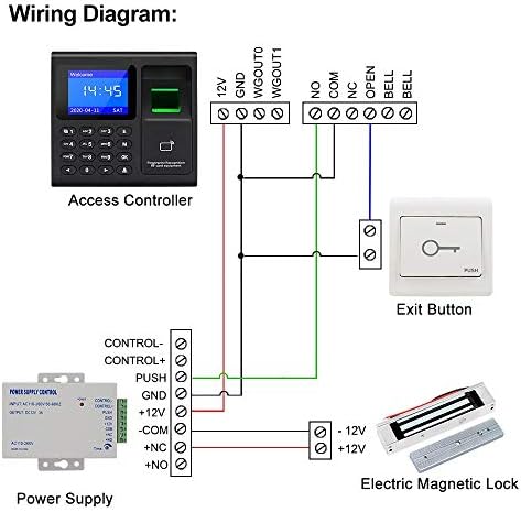 • 1, Introduction: This is a complete access control system, contain a fingerprint access controller, a power supply, a magnetic door lock, a switch button, and 10 pieces 125KHz RFID keychains. Off-line working, support to download attendance reports with U disk.