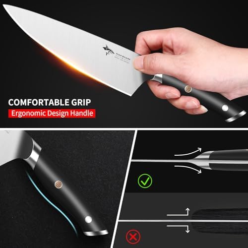 - UNRIVALED BALANCE: The Mad Shark Chef's Knife is as balanced as a yoga master in the kitchen, and gripped in your hand like a trophy of victory. Whether you hold it casually or like a professional chef, it's a lasting companion that won't cramp your style. The non-slip grip works so well that you can chop veggies in the shower and this knife will hold on to your hand like a lifeguard. It won't come off even if your hands are covered in oil