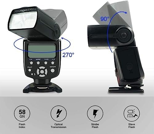 - [LCD Display]: SLFC Camera Flashes contains a simple interface and settings menu to get the lighting correct with minimal effort. Flash head angles from 0 to 270 degrees. Offers a good mount of flexibility for different light intensities. camera flash offers all of the most common modes and settings for a basic, affordable accessory. Can be used as a slave flash for use with off-camera shooting. Swivels for off-axis shooting as well.