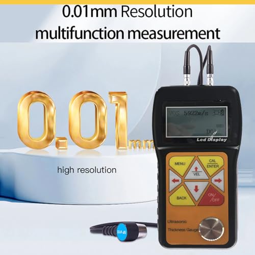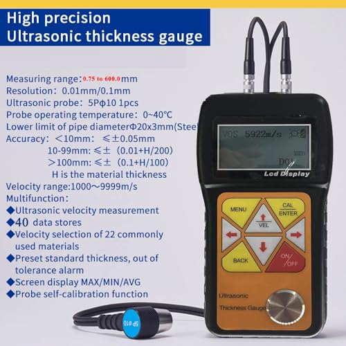 Ultrasonic Thickness Meter Gauge Sheet Metal Pipes Glass Thickness Gauge Sound Velocity Meter with Calibration Block Measuring Range 0.75mm to 600.0mm 0.03inch to 23.62inch