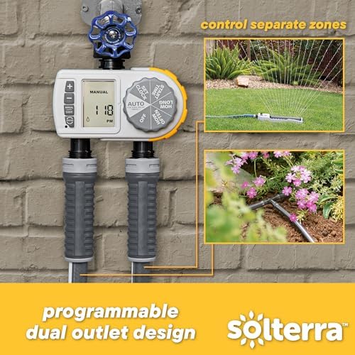 This Dual Outlet Watering Timer will turn your hose faucet into a programmed sprinkler system in minutes. No more dead plants because you forgot to water them. No more soggy lawns because you forgot to turn the water off. Just set the timer and go! With a large digital display and simple controls, programming is fast and easy. Built with high quality materials and water-resistant construction you can count on many years of dependable service. Install a hose faucet timer to any standard outdoor hose faucet and program it to water at your convenience. Program it to water during ideal times to minimize evaporation and save yourself time and money while making your yard lush and green. Timer has six settings: OFF, AUTO, CLOCK, START TIME, HOW LONG, and HOW OFTEN. Featuring a rain delay setting, it is easy to conserve water if it rains. Press the manual button to instantly access your water without interrupting the timer’s programmed settings. There is no need for tools. The swivel is designed for hand-tightening and the battery case opens with ease. Plus, the timer retains the program while changing the batteries.