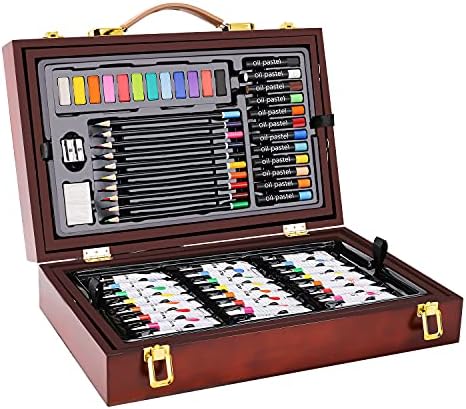 Set de arte Vigorfun Deluxe en estuche de madera, con pasteles suaves y al óleo, pinturas acrílicas y acuarelas, acuarela, bocetos, lápices de carbón y colores, tartas de acuarela y herramientas
