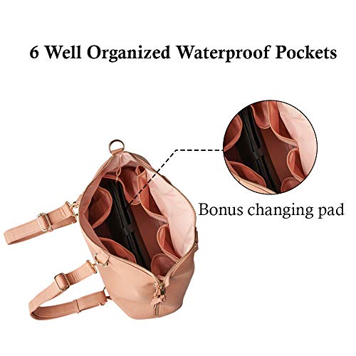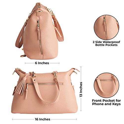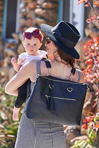 - Exterior is water-resistant pure vegan leather (100% polyurethane) and has chic hardware and features making this diaper bag stylish enough to be a welcome addition to your own accessories