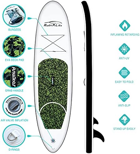 Discover the fun of paddleboarding with this Feath-R-Lite inflatable stand up paddle board, designed for beginners and perfect for marine, river, and lake activities. The board is made of durable double-layer PVC material, with a high-density wire drawing and airtight valve, ensuring safety and longevity. It measures 10' x 30" x 6" and has a maximum weight recommendation of 280 pounds, while weighing only 16.7 pounds itself. The package includes an adjustable aluminum paddle, high pressure pump, removable sup fin, travel backpack, sup leash, repair bucket, and instruction manual. The board is easy to inflate and deflate, making it convenient to store and transport. Experience the beauty of water activities with this Feath-R-Lite paddle board.