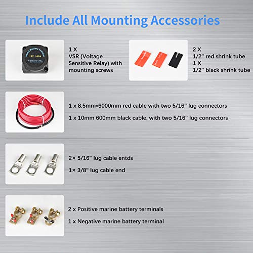 MaySpare Dual Battery Isolator Kit 12V 140Amp Voltage Sensitive Relay VSR Double Battery Automatic Charger & Wiring Cable Kit