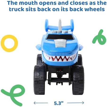 - BOCA SE ABRE: La boca del tiburón se abre y se cierra cuando el camión tiburón se sienta sobre sus ruedas traseras, como un camión monstruo real. Funciona con 3 pilas AA (no incluidas).