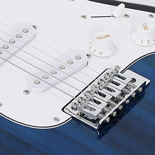 Smartxchoices 39’’ Electric Guitar is a brand new functional beginner guitar. High quality and beautiful surface make it an ideal choice for you. It is lightweight and easy to carry with the included guitar bag. Made of all wood construction with steel strings, delivers a smooth tone and creates bright sound. All accessories you need to start playing the guitar right away are included. This blue guitar is perfect for guitar beginners and would make a decent gift. Kids, teens, and adults can learn and creat wonderful music with this full size guitar kit ! Features: ♬ 39" Full Size Blue Electric Guitar(Right-handed),ideal for beginners,aspiring musicians and expert guitar heroes. ♬ Ultra-Thin slick design for easy control during playing, either sitting or standing up. ♬ Fantastic paint and smooth finish, great decoration in your room. ♬ The natural, bright sound complements the warm sounds of the solid wood. ♬ Comes with a 10W amp and carry bag for easy portability. ♬Headphone Output Connection, there are five levels on the guitar to adjust the timbre. Guitar Specifications: Color: Blue/Black Hand Orientation: Right-handed Painting Surface: Polished Body: Hardwood Neck: Maple Wood with Truss Rod Finger Board: Rose Wood Frets: 22 String Length: 25.59" / 650mm Pickups: Single Coil X3 Regulator volumex1, tone x 2, 5 scale tone changer Machine Heads: Chrome Diecast AMP Specifications: 10 watts Two band EQ Volume, base tone and treble control Headphone output connection Package Included: 1 x 39'' Electric Gutiar 1 x 10w amplifier 1 x Guitar Bag 1 x Strap 1 x Guitar Cable 1 x Additional Strings Set 2 x Picks 2 x Allen Key 1 x Tremolos Rod