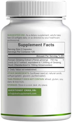 - Propósito – Las potentes cápsulas blandas de ginseng de Deal Supplement provienen de ginseng recién seleccionado a mano y obtenido desde Corea. Esto proporciona una experiencia de ginseng más verdadera y auténtica con cada porción.