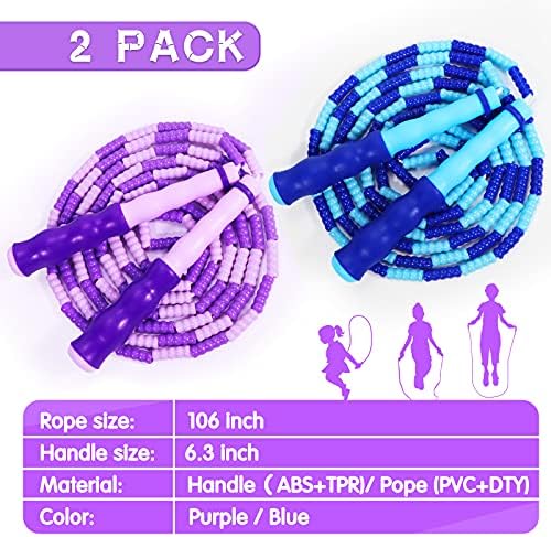 • 2 Pack Premium Kids Jumping Rope 106 Inch:The kids jump rope is 106 inch long. Features 1 inch(2.5cm) plastic segmented beads over a solid, long-lasting braided nylon cord, suitable for kids,children and students.