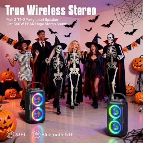 - EMPAREJAMIENTO ESTEREÓ WIRELESS DE 360W PEAK E IPX5 RESISTENTE A LAS GOTAS: La batería de larga duración y potente permite que tus altavoces para exteriores grandes reproduzcan durante 24H. El Bluetooth inalámbrico empareja 2 altavoces T9-2 para crear un sistema estéreo de dos canales inalámbrico real que ofrece 160W RMS de sonido estéreo real (T9-2 no puede emparejarse con T9). El T9-2 es resistente a las gotas IPX5, así que nunca tendrás que preocuparte por que la fiesta se moje y se vuelva salvaje. Por favor, utiliza el adaptador de corriente de 5V/2A para cargar el altavoz Bluetooth resistente al agua (no incluido).