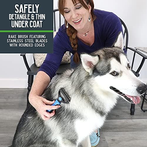 - HIGH QUALITY DOG GROOMING RAKE: A scratch-free dog grooming rake that has a double-sided comb that removes dead hair, tangles, knots, dander, and trapped dirt. Made from heavy duty stainless steel that is safe for both you and your pet.