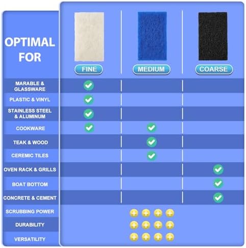 - PERFECT CLEANING KIT FOR EVERY SURFACE features three distinct pads (fine, medium, coarse), designed to handle a range of cleaning tasks from delicate to heavy-duty, work great on piano, glass, stainless steel, vinyl, teak, ceramic, wood, boat bottom, wheel and aluminum etc.