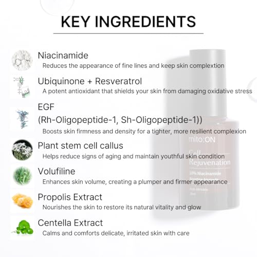 Mito-on Cell Rejuvenation Anti-Aging Serum, 30ml / 1.01 fl.oz –10% Niacinamide, Vitamin B3 and Antioxidants, Centella + EGF for Anti-Aging, Wrinkle Reduction, Pore minimization, Korean Skin Care