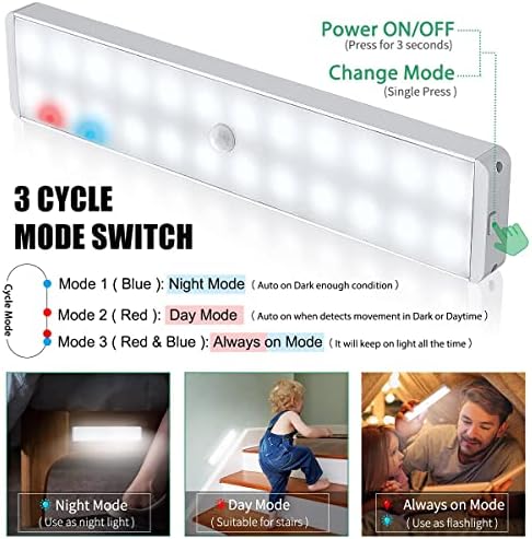 - 4 CYCLE MODES-- MODE 1: Night Mode ( Blue indicator light flash 1s), MODE 2: Day Mode ( RED indicator light flash 1s), MODE 3: Always On Mode ( Red & Blue indicator light will flash 1s ), MODE 4: OFF;
