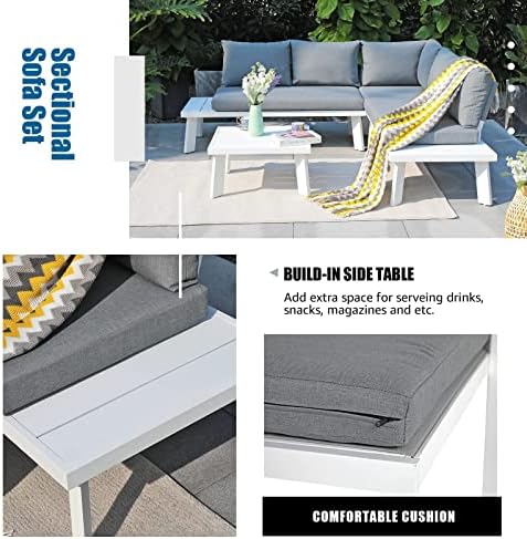 - FUNCTIONAL DETAILS - The L-shaped patio furniture offers built-in side tables at the end on each side, adding extra space to place drinks or other items. Adjustable feet at the bottom of table and chairs are used for helping with un-even surfaces to keep the furniture stability.