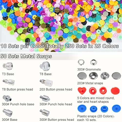 - Lo que obtienes: obtendrás 300 juegos de botones de broche T5 de plástico, 25 botones de broche de plástico de colores arcoíris cada 10 juegos y 10 juegos de botones de broche de metal plateado y 40 arandelas, pinzas, destornillador Aswl, mango extra largo, base T3 T5 T8, cabezal de presión, cabezal de presión, cabezal de punzón. Una gran cantidad y colores vibrantes de botones de broche satisfarán tus demandas en costura y proyectos de bricolaje.
