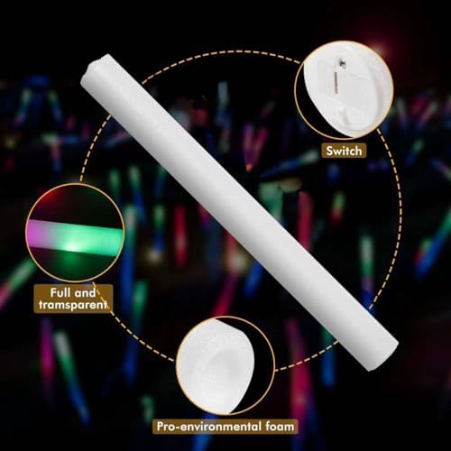 • High-quality & Safe: The light sticks are made of eco-friendly soft foam and high-quality plastic, which are bendable, durable and harmless to children. Each foam stick comes with 3 long-lasting batteries and an On/Off switch function to save battery life when not in use.