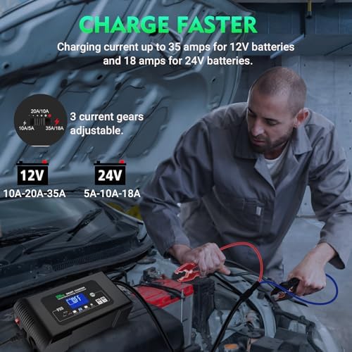 - WIDELY USED - 35A car battery charger charges all 12V/24V Lithium, LiFePO4, and Lead Acid (AGM/Gel/SLA..) batteries with 35Amp max current! The one-touch start ensures hassle-free operation, while the compact design fits seamlessly in garages, boats, or travel kits. Perfect for fast charging various batteries and large vehicles such as trucks, boats, motorcycles, golf carts, tractors, and RVs NOTE-It will not jump start the battery or repair a completely lost battery, the battery voltage is not lower than 2.0V.