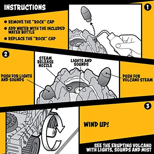 - MADE FOR EXCITEMENT: A gift they’ll remember! This volcano toy set includes a 3” light-up volcano with roaring dinosaur sounds, dinosaur scene, wind-up car on tracks, and a water bottle for hours of fun.