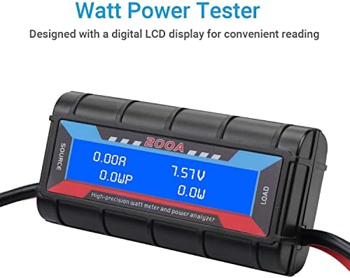 Descriptions:HTRC 200A watt meter and power analyser isn't just a watt meter,it's the All-In-One Meter.A power meter, a volt meter, an amp-hour meter, ammeter and energy meter.It is indispensable for analyzing, testing and troubleshooting any DIY DC power project.Very accurate in giving DC volt, ampere and wattage.This Watt Meter only requires a tiny 7mA draw to operate, there will be no significant reduction in your powerproduction during usage.Fetures:* Predict model airplane flight time* Evaluate R/C battery charging efficiency* Choose the best propeller/most efficient motor* Check for wiring and connector power loss* Measure power and energy consumption of any battery powered device* Ensure peak currents are safe for motor, ESC & Battery as well as wiring and connectorsConection:Connect "SOURCE" Red wire to positive(+) and Black to Negative of battery or any DC electricity source.Similarly,"LOAD" wires should be connected to any DC electricity based load.Once there is power flowing through, the device will initialise and show you a full range of ratings including:Current (Amps/A) at the present momentVoltage (Volts/V) at the present momentPower (Watts/W) at the present momentTotal Amps (Amp hours/Ah) since device initialisedTotal Power (Watt hours/Wh) since device initialisedHighest Voltage Maximum (Vm) since device initialisedHighest Power Peak (Watt Peak/Wp) since device initialisedHighest Current Peak (Amp Peak/Ap) since device initialisedSpecifications:Operates from 4.8v to 60v or 0V to 60V with optional auxiliary battery..Measures 0 to 200A with a resolution of 0.01AMeasures 0 to 60V with a resolution of 0.01VMeasures 0 to 6554W with a resolution of 0.1WMeasures 0 to 650KWh with a resolution of 0.1WhMeasures 0 to 6554Ah with a resolution of 0.01AhCable:8AWG