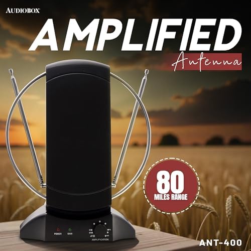 Audiobox ANT-400 Amplified Indoor Antenna with 80-Mile Range, Adjustable Gain Control, 180° Rotating Design, and UHF/VHF/FM Reception