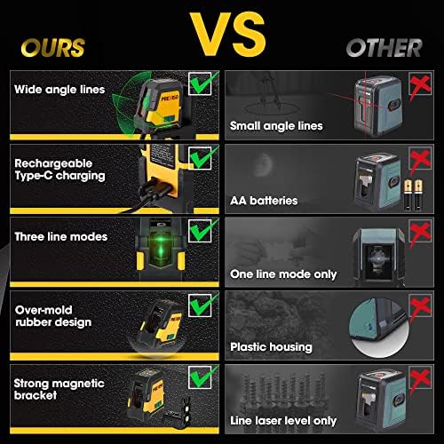 - PREXISO 100Ft Rechargeable Laser Level - Rechargeable & Green Beam: PREXISO line laser built-in 2600mAh Rechargeable Lithium-ion Battery. PREXISO laser level dustproof, wear resistant, cold and high temperature. Covered by TPE soft rubber for shock resistant and comfortable grip; Green laser is 3 times brighter than red laser with the same light source, and gives you maximum green laser brightness up to 100Ft