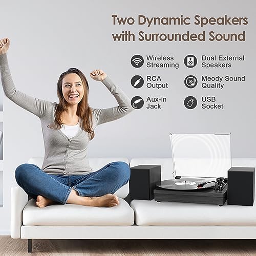 Record Player with Dual Stereo Speakers, Vinyl Record Player with 3 Speed Support Wireless Connection RCA Output Aux in USB Vintage Design Turntable Black