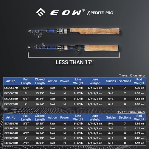- PREMIUM QUALITY: EOW XPEDITE PRO telescopic casting and spinning fishing rods are crafted from 24T carbon and epoxy for sensitivity, durability, and performance. The tips are solid carbon for extra flexibility. The reel seats are high-quality ABS with CNC aluminum parts, and the grips are dense and resistant EVA with cork. With these top-notch components, EOW delivers the ultimate travel telescopic fishing rods.