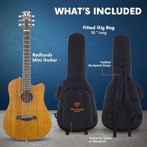 - COMPACT TRANSIT: The Redlands Mini Acoustic Guitar comes standard with a custom gig bag to protect your instrument. It measures 35” in the bag, so you can easily take it along—with help from the padded backpack straps—wherever your journey leads.