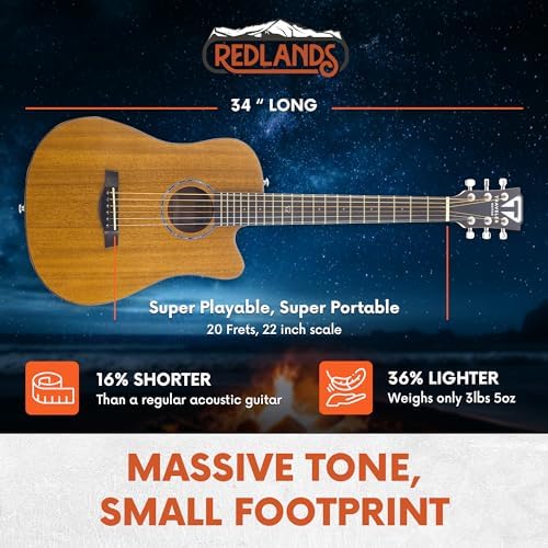 - BUILT FOR TRAVEL: Our Redlands Mini delivers big-scale sound even though it is smaller than a typical acoustic guitar. Measuring 34” and weighing 3 lbs 5 oz, our compact yet high-quality guitar will be your steadfast road companion.