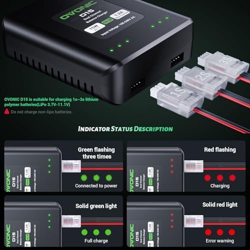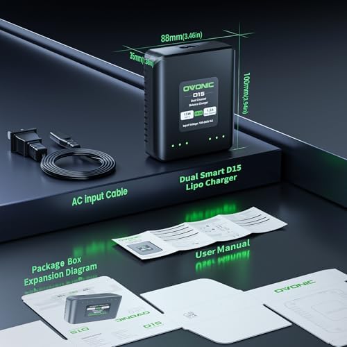 OVONIC D15 Dual LiPo Battery Charger AC 15W 1.2A for 1S 2S 3S Lipo Batteries, RC Battery Charger