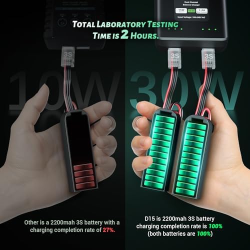 - 【15W+15W Dual Channel】: Charge two LiPo batteries simultaneously with 15W+15W dual channels, each supporting a charging current of 1.2A. Designed for LiPo batteries with cell types ranging from 1S to 3S, this allows for independent and efficient charging.