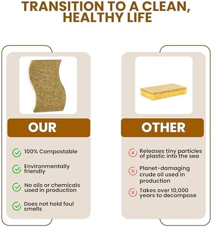 • Compostable and Biodegradable: Our dish sponges for washing dishes are made with natural cellulose and coconut husk, plant-based materials that are gentle on the planet. The cellulose is biodegradable and the coconut husk is compostable, promoting minimal waste.