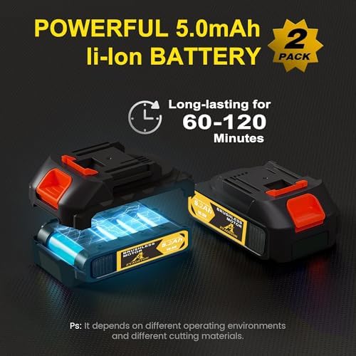 - 【Smart Auto-Lubrication & Extended Runtime】Our patented AUTO LUBRICATION SYSTEM automatically maintains chain sharpness during operation. Combined with 2*5.2Ah battery packs and 2A fast-charger, enjoy 120+ minutes continuous runtime (50% longer than competitors) with only 90-minute full recharge.