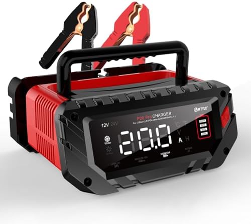 - ✅【Large LCD Display & Portable Handle】The digital battery charger owns a larger screen that clearly shows charging voltage and current, power percentage, battery full,temperature, battery full, summer mode, winter mode, easily monitor your battery's health. This 12V/24V automotive charger adopts Clip Organizer & Foldable Handle design, alowing you to wrap and store messy power cords at the back side. Portable charger easy to carry, suitable for various occasions charging requirements.