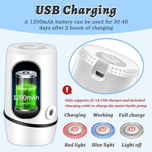 • [Efficient and Convenient Life Experience] - The 5 gallon water dispenser comes with a 1200 mAh rechargeable battery and USB charging cable, charging is simple and convenient, it can be used for 30-40 days or 4-5 bottles of 5-gallon water bottles after being fully charged, no need to charge every day .The water pump has a built-in 4w powerful pump, which can pump 1.5 liters of water in 1 minute, and the speed is 1.5 times that of ordinary water pumps.