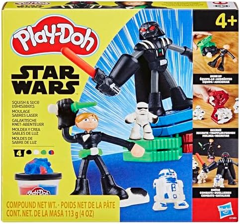 The Force of creativity is strong with the Play-Doh Star Wars Squish & Slice Lightsabers toy set! Recreate the iconic battle between Luke Skywalker and Darth Vader with bendy sensory play figures and Play-Doh tools. Make a Play-Doh cape for the Darth Vader action figure and equip him with his detachable red Lightsaber accessory. Meanwhile, prepare Luke for battle with a Play-Doh Lightsaber, belt, and R2-D2 by his side. 4 mini Play-Doh cans help get their creativity into hyperdrive. Imagination toys like this Play-Doh playset make great Star Wars gifts for boys and girls 3 years and up! Star Wars products are produced by Hasbro under license from Lucasfilm Ltd. PLAY-DOH and HASBRO and all related trademarks and logos are trademarks of Hasbro, Inc.