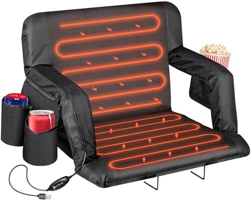Smartxchoices 25" Wide Heated Stadium Seats for Bleachers, 6-Reclining Positions with Back and Cushion, Arm Rests, 3 Pockets, 2 Cup Holders, Anchor Straps, Portable Folding Seat with Shoulder Straps