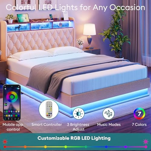 Full Bed Frame with Storage - Lift Up Full Size Bed Frame with Headboard, Upholstered Platform Bed with LED Lights & Charging Station, Hydraulic No Box Spring Needed Wood Slats Support, Beige