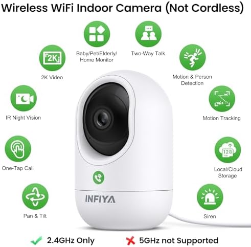 - High 2K Resolution with 360° Pan/Tilt & IR Night Vision: INFIYA wired home security cameras(only support 2.4GHz WiFi & 5GHz not supported & non-battery) present a crystal clear image in 1296P(2304*1296P), which captures more details. With a 355° Pan/Tilt, this home camera could be rotated up, down, left, and right via a phone app to monitor a wider point of view with everything in sight. Even at night, this security camera continues to work via infrared light. Safety is guarded anytime anywhere