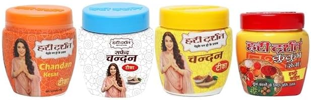 Chandan Tika with Kumkum Roli Combo Pack Chandan Tika-, Orange Chandan Tilak, Yellow Chandan Tika, White Chandan Tika (Pack of 4), Roli Tikka for Pooja, Navratri, Janmaasthmi, Hindu Gold Pooja